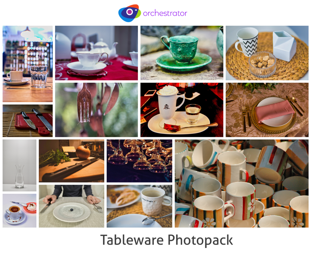 Content: Collection of 37 photos of tableware, including cups, dishes, straws, mug, sugar bowl, teapot, forks, knife, sugar spoon, dessert fork, napkin, wine glass.